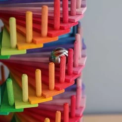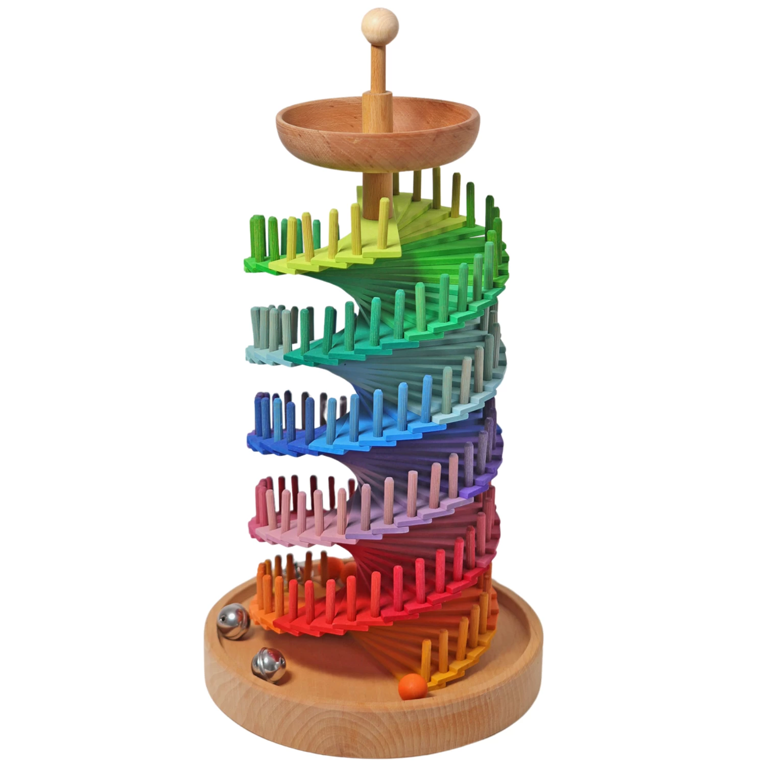This elegant ball run invites children to slow down, focus, and build something truly special. With 80 colorful wooden panels and 176 dowels, the Double Spiral Ball Run twists into two graceful spirals that guide marbles—or the four included bells—on a gentle, musical descent.