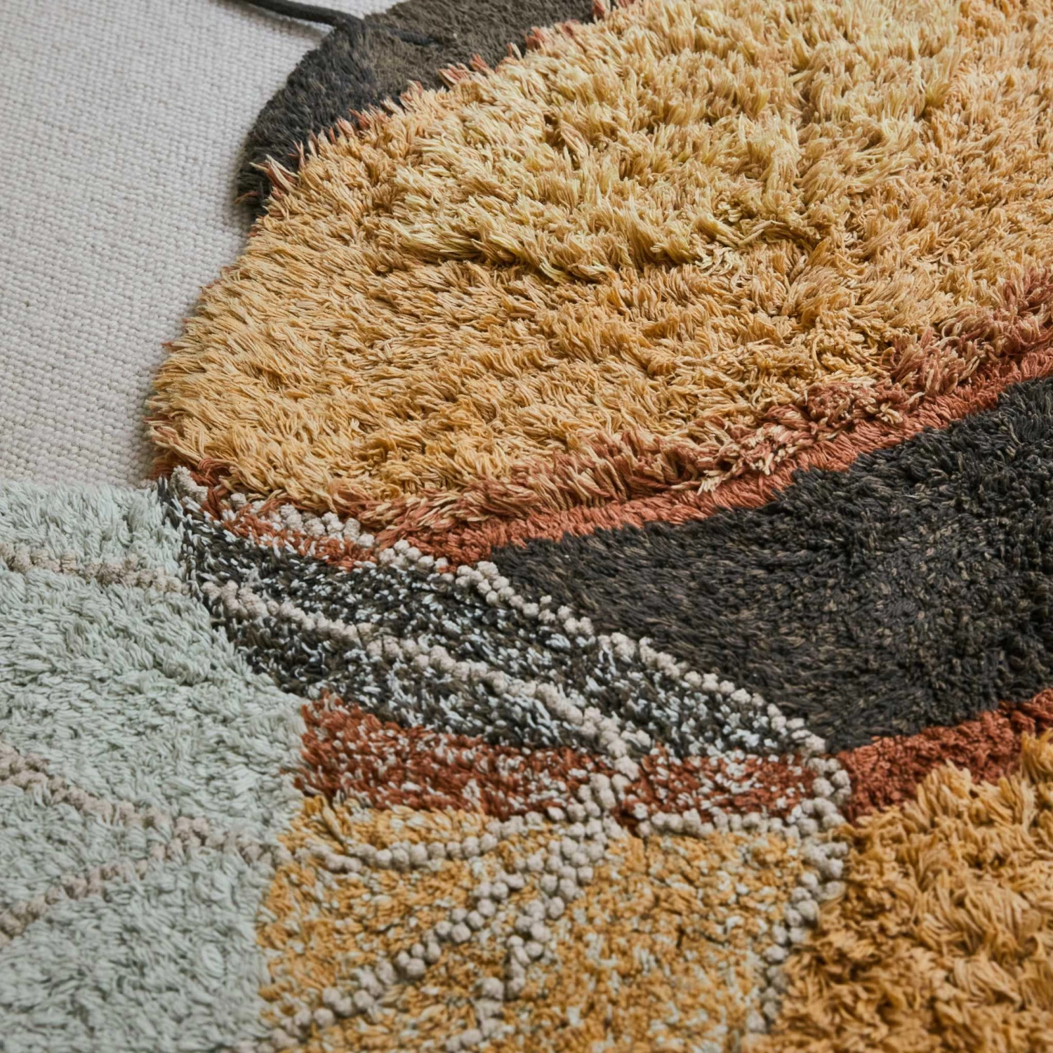 This handcrafted rug, features a striped body in honey and dark grey cotton colours, wings and fluffy parts with a longer pile. It is finished with dark grey cords as antennas and little legs.