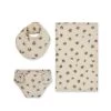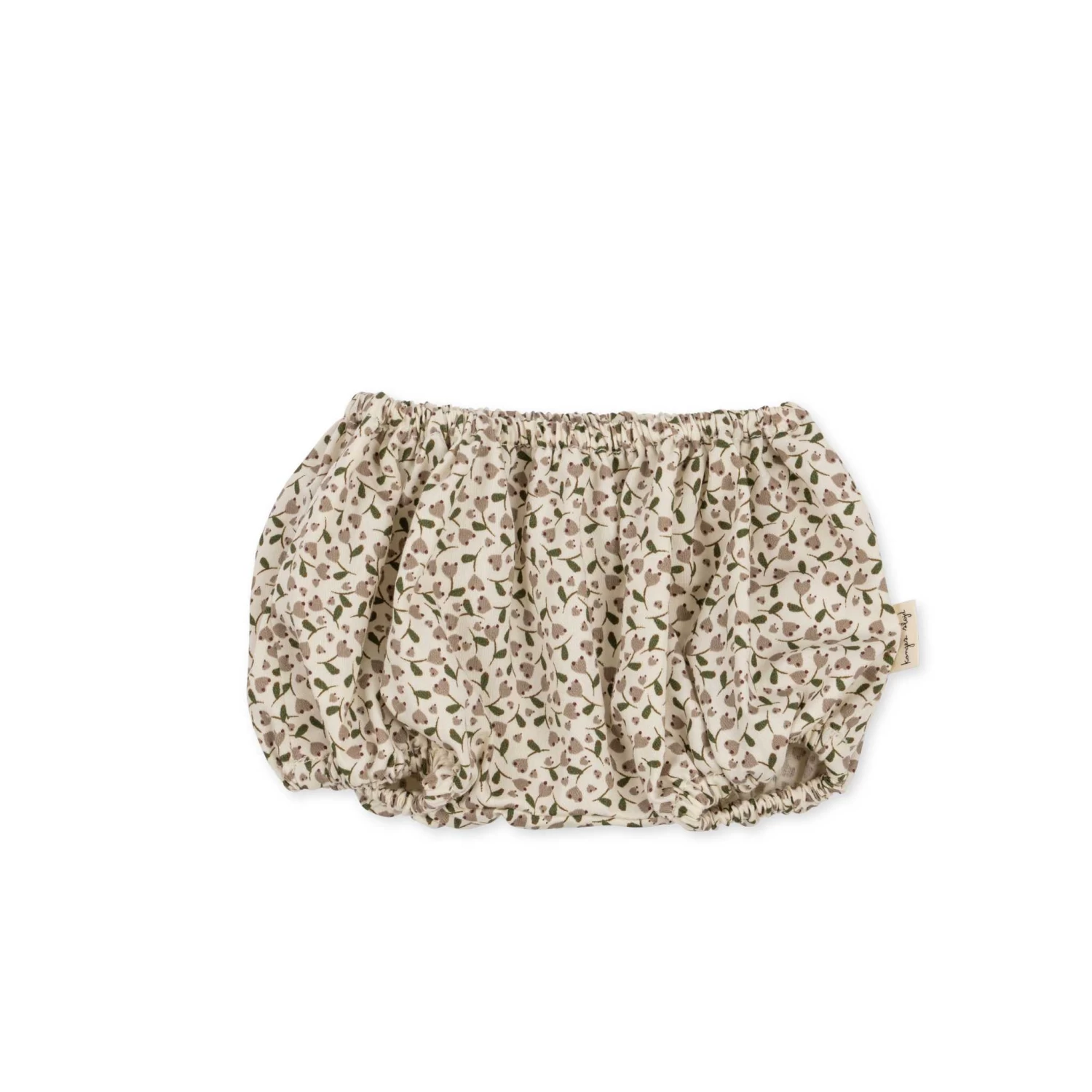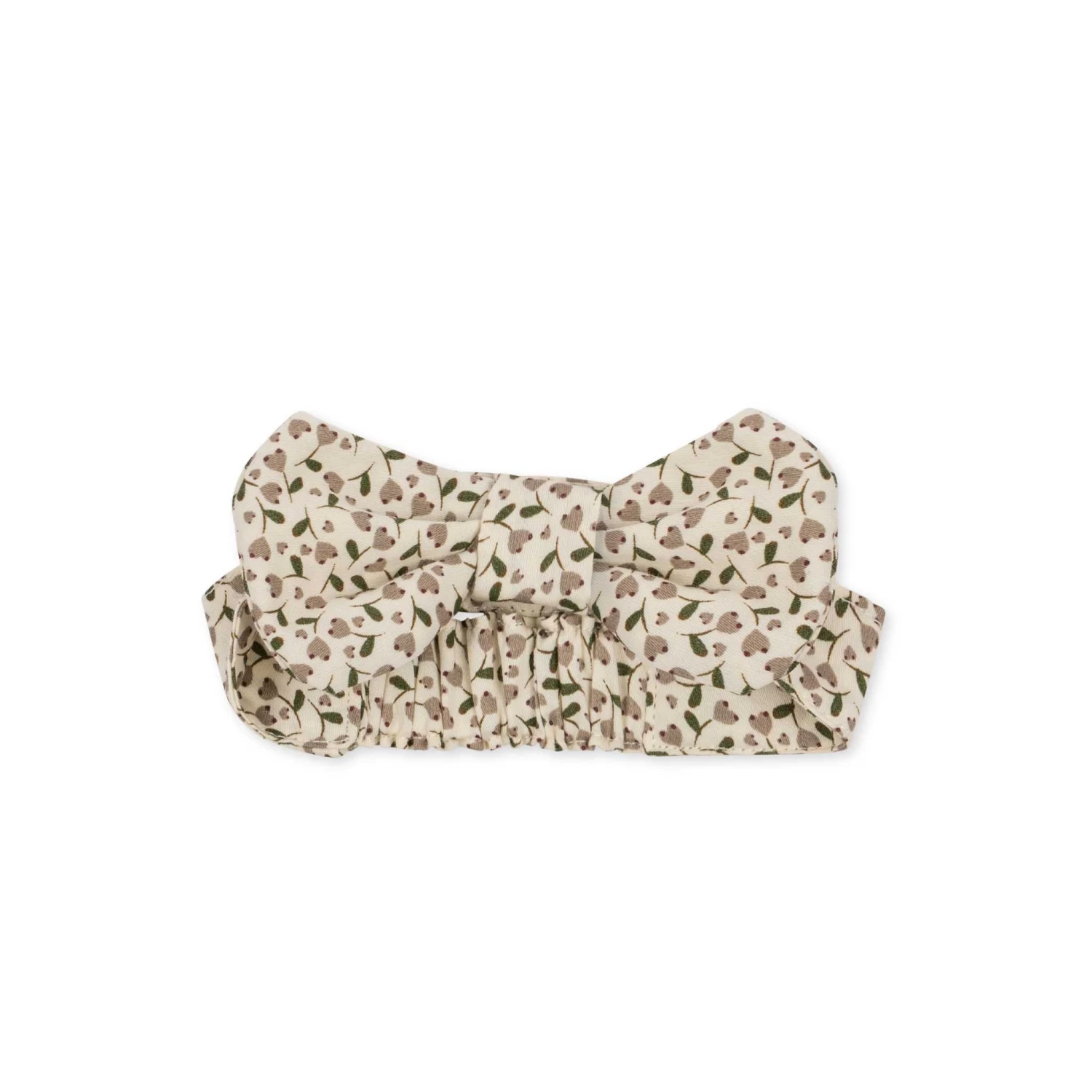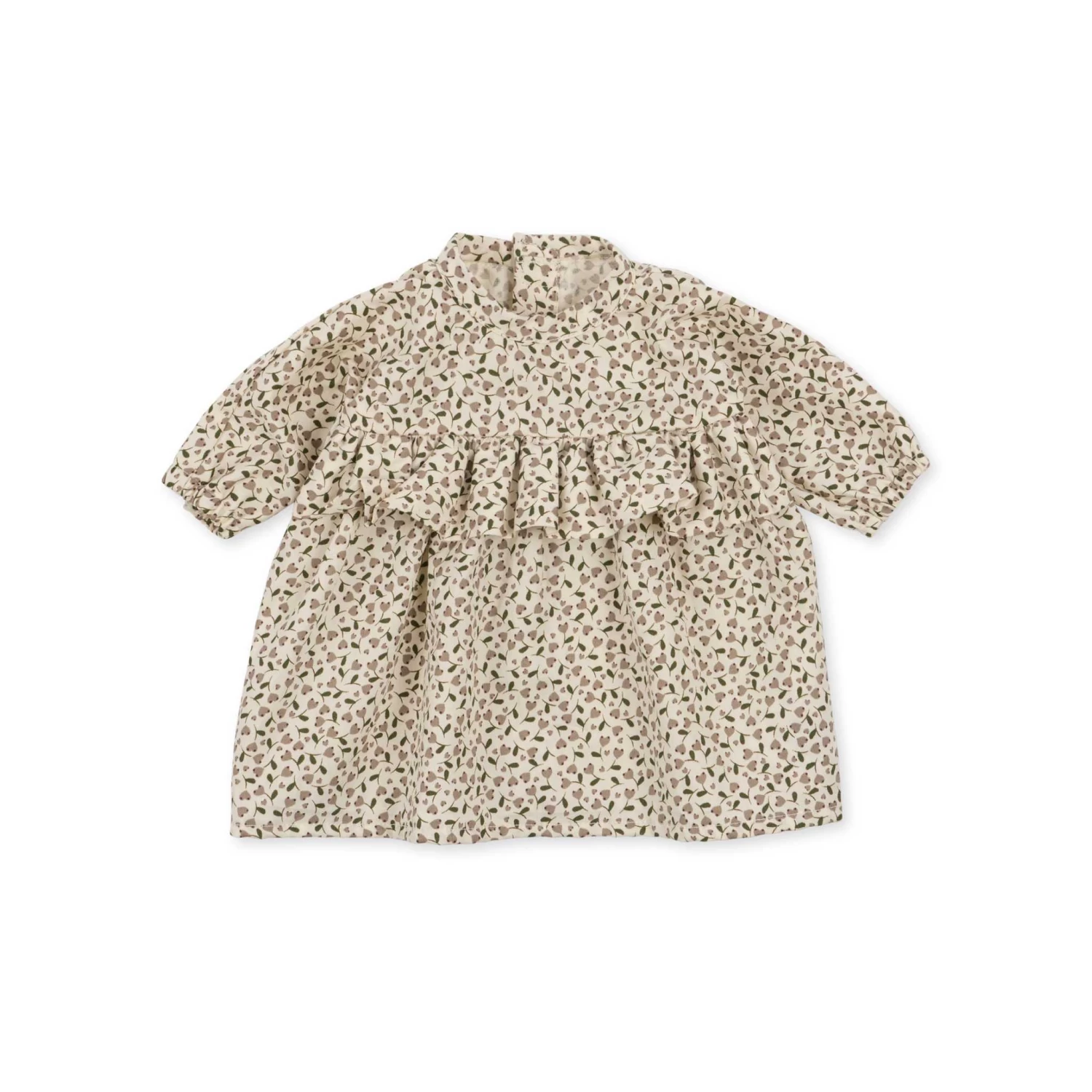 In Konges Slojds very popular Milk Tank print (little pink heart shaped flowers with green details) – it even comes on a little cardboard coat hanger.
