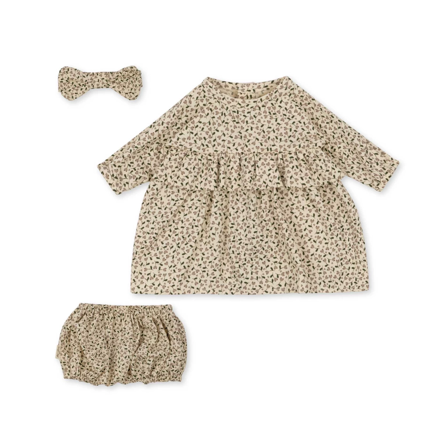 Your little one is going to love dressing dolly up in this sweet outfit. It includes a dress, little bloomer shorts and a very smart little head band!