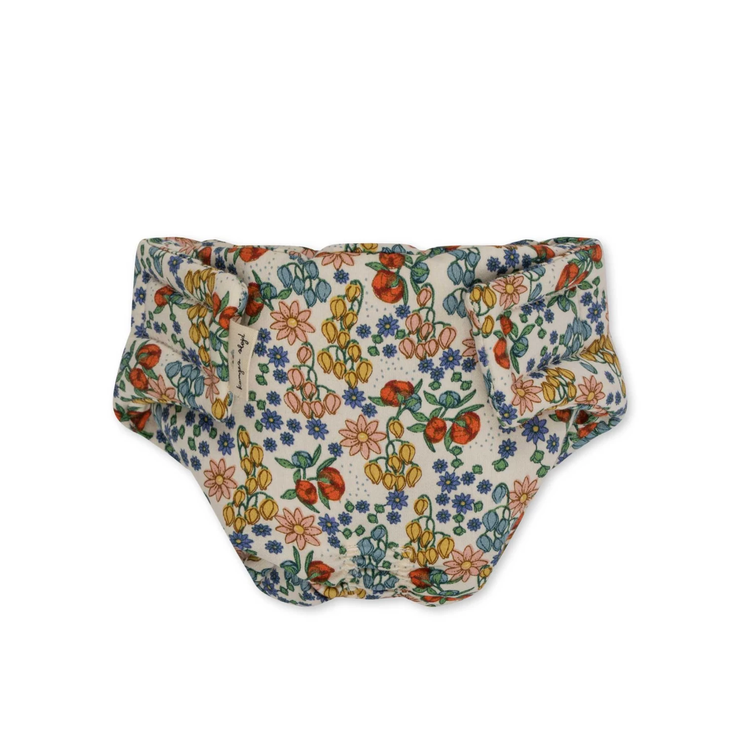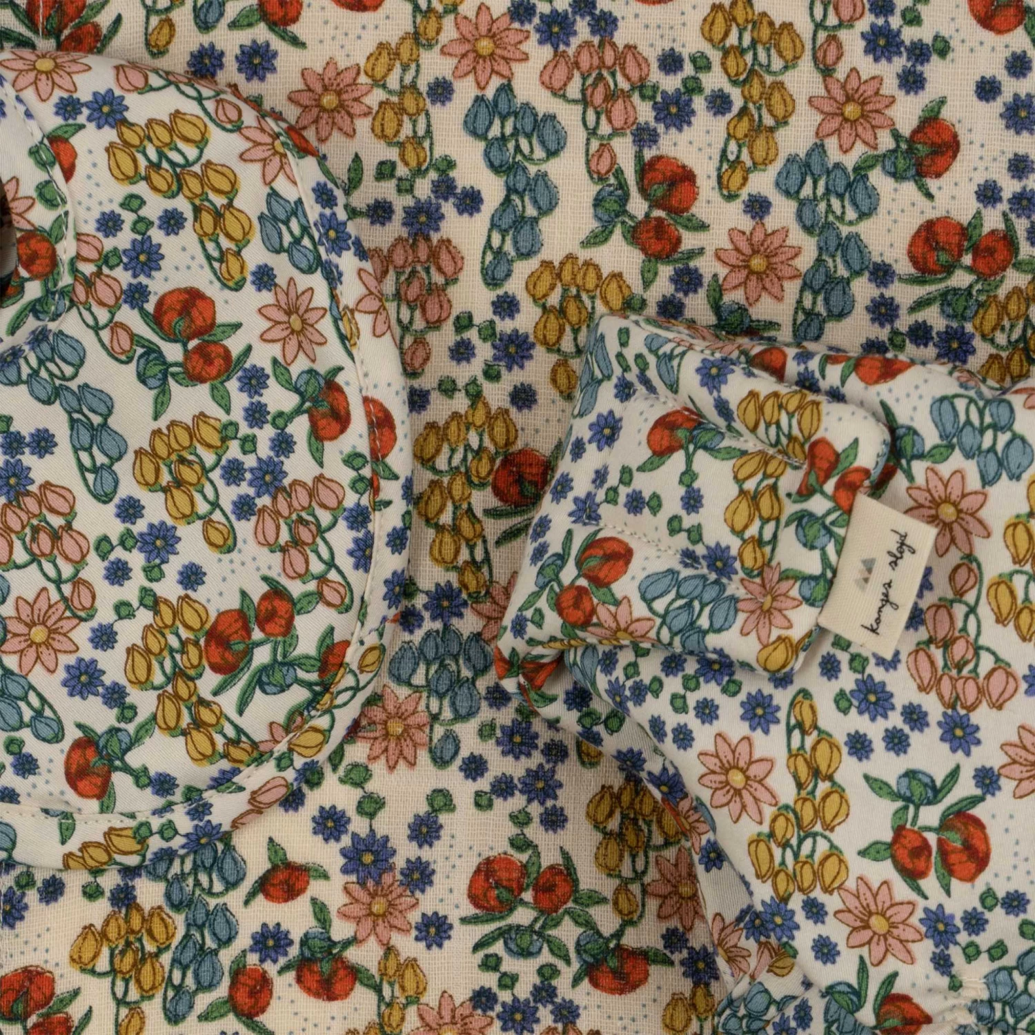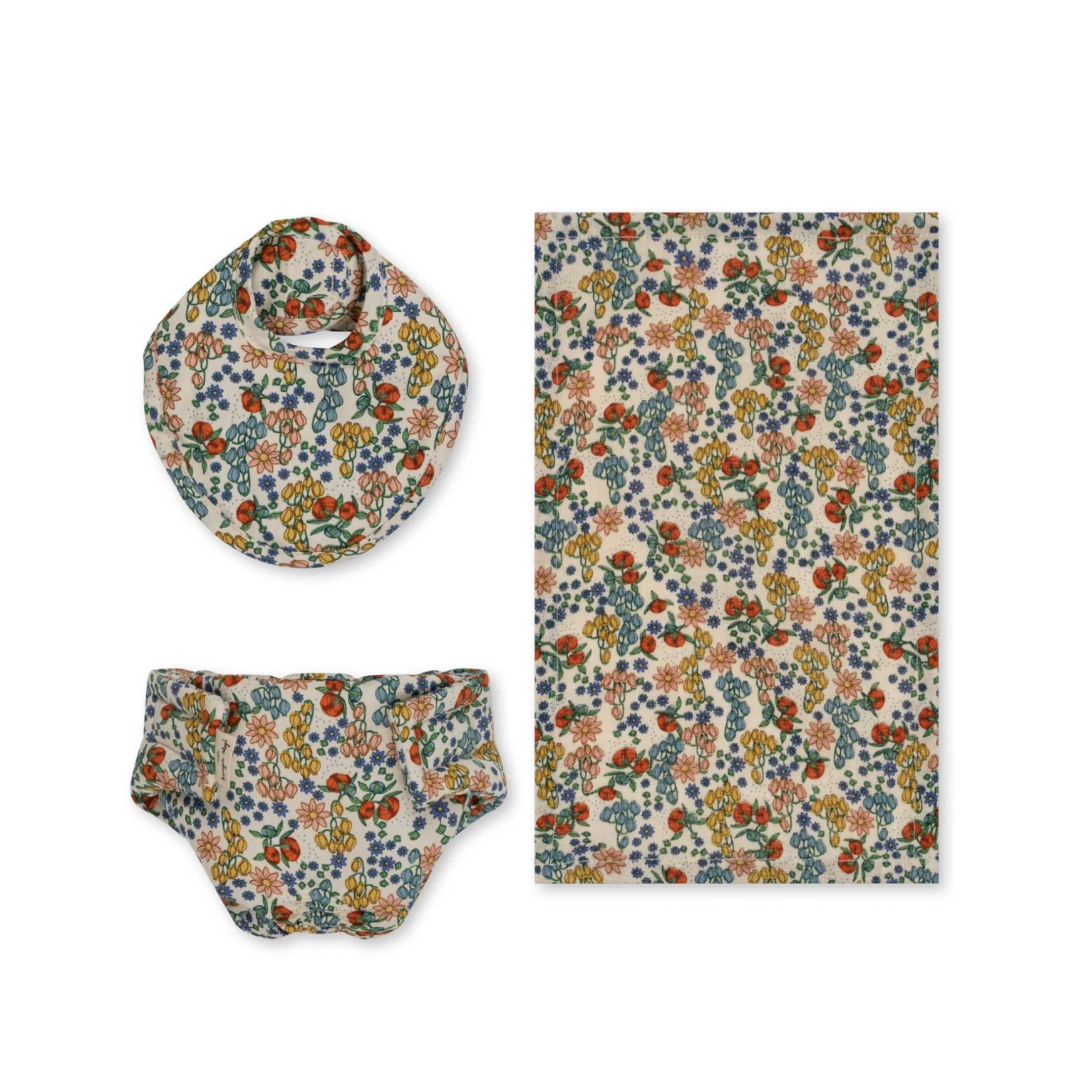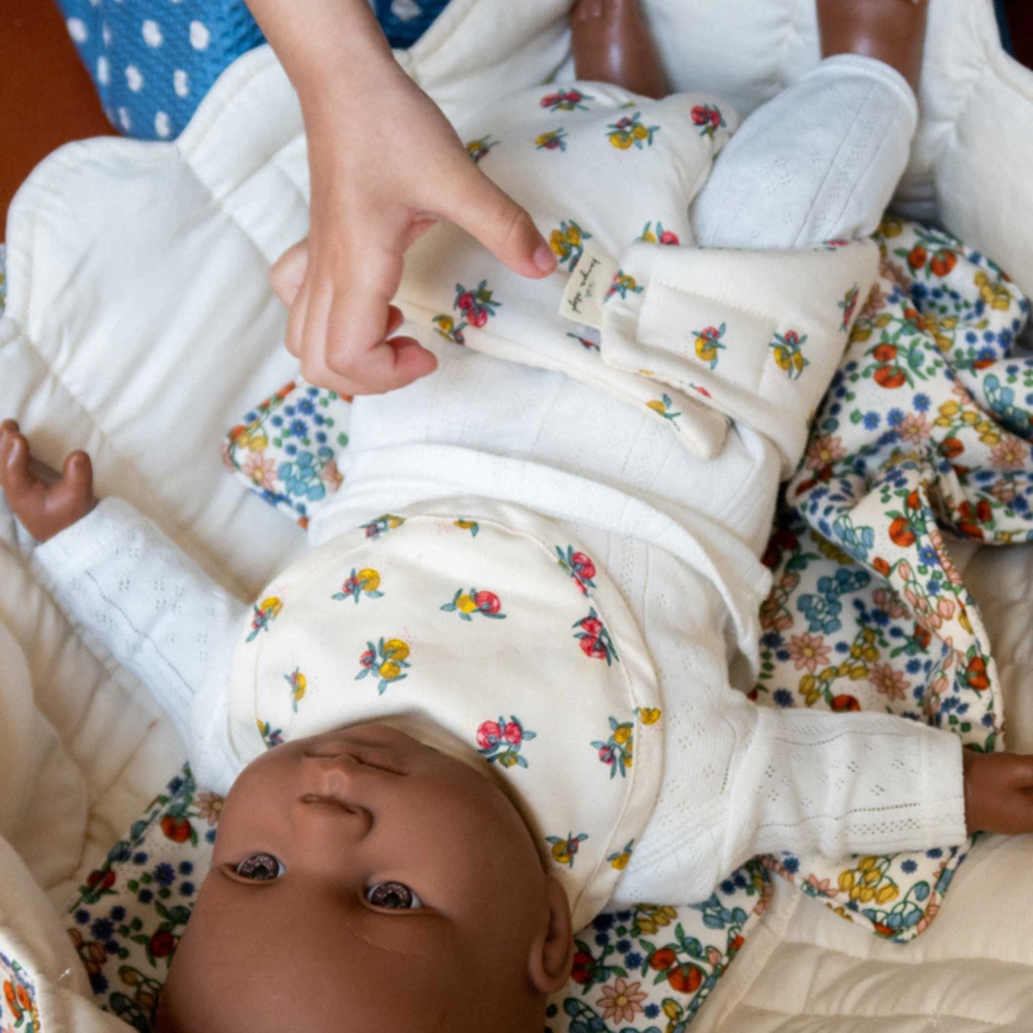 This sweet dolls set from Konges Slojd includes everything your little one needs to ensure dolly is well looked after. Just the thing for all their feeding and changing needs. There’s a little muslin cloth, and a bib as well as a nappy with velcro fastening for easy changing. This sweet set in the Bibi Fleur print (different shaped flowers, in vibrant colours which almost appear to be dancing) is just the thing for any little doll lover who loves to dress and care for dolly. The sweetest thing to watch as they get dolly ready for feeding or changing her nappy.