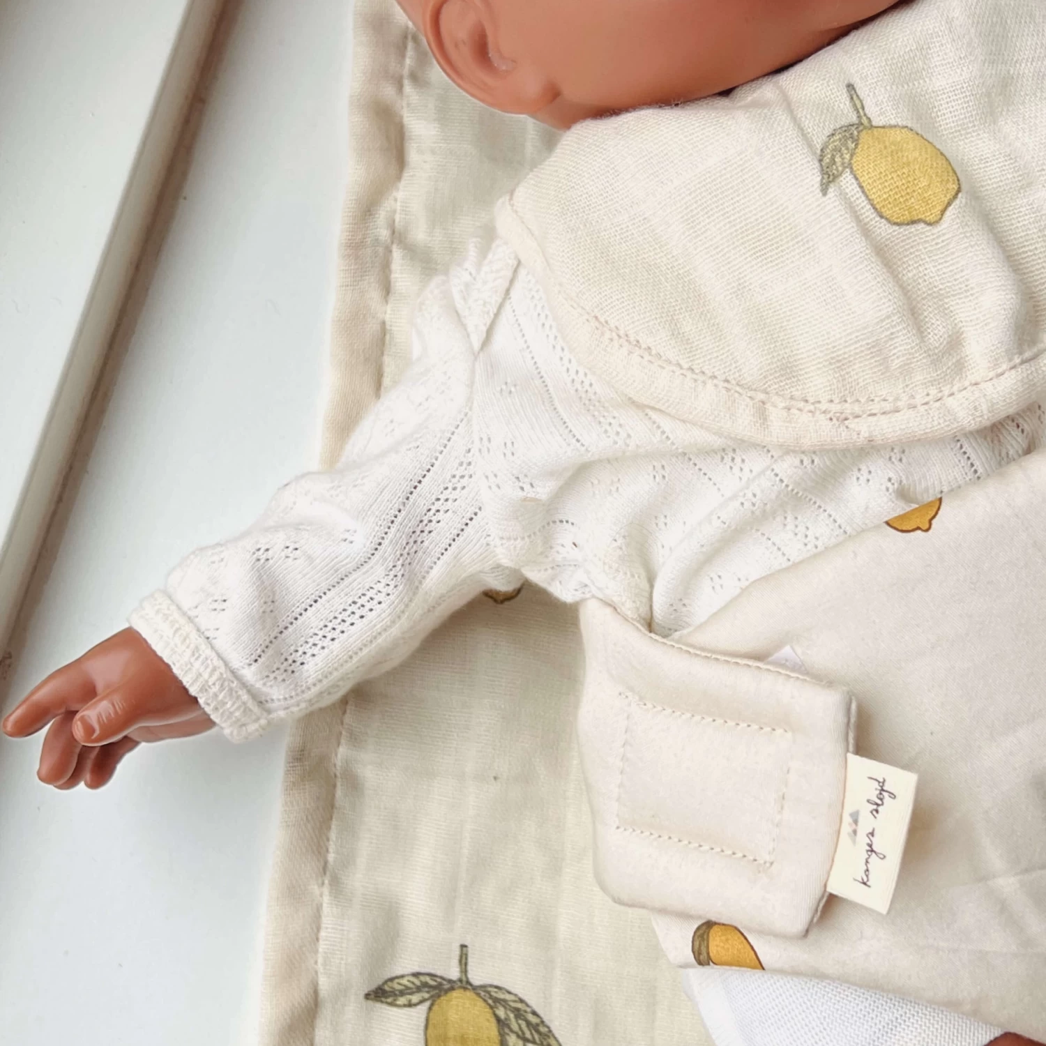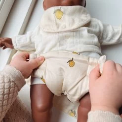 This sweet set includes everything your little one needs to ensure dolly is well looked after. There’s a muslin cloth, a bib and a nappy with velcro fastening. This sweet set in the iconic Konges Slojd lemon print is just the thing for any little doll lover who loves to dress and care for dolly.