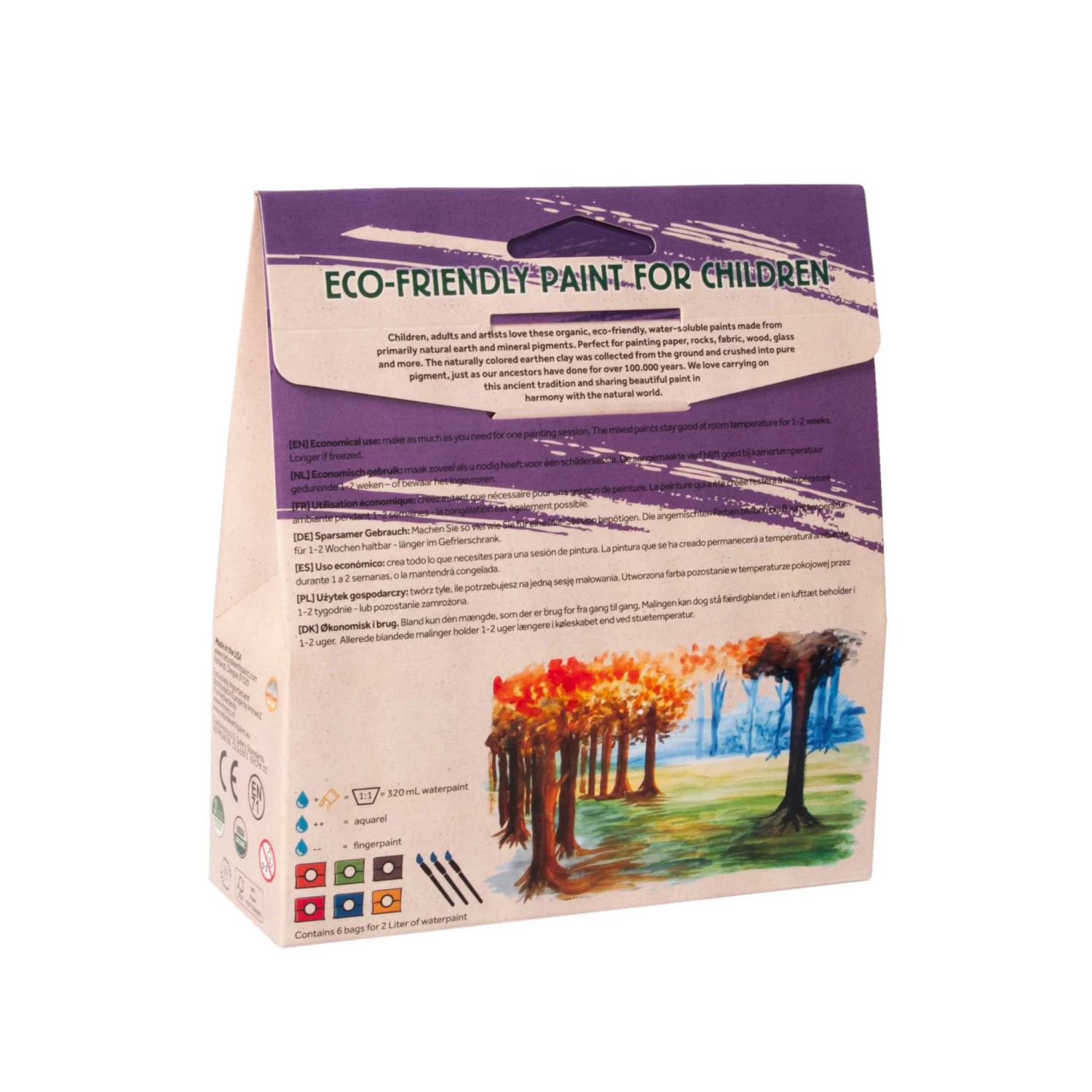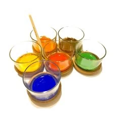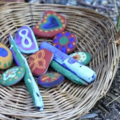 The paints in the set are mixed with water to create which ever consistency you desire – slightly thicker and creamier for normal painting and finger painting or add some water to create watercolours. Incredibly versatile they can be used on a wide range of surfaces – paper, rocks, fabric, wood, glass and more.