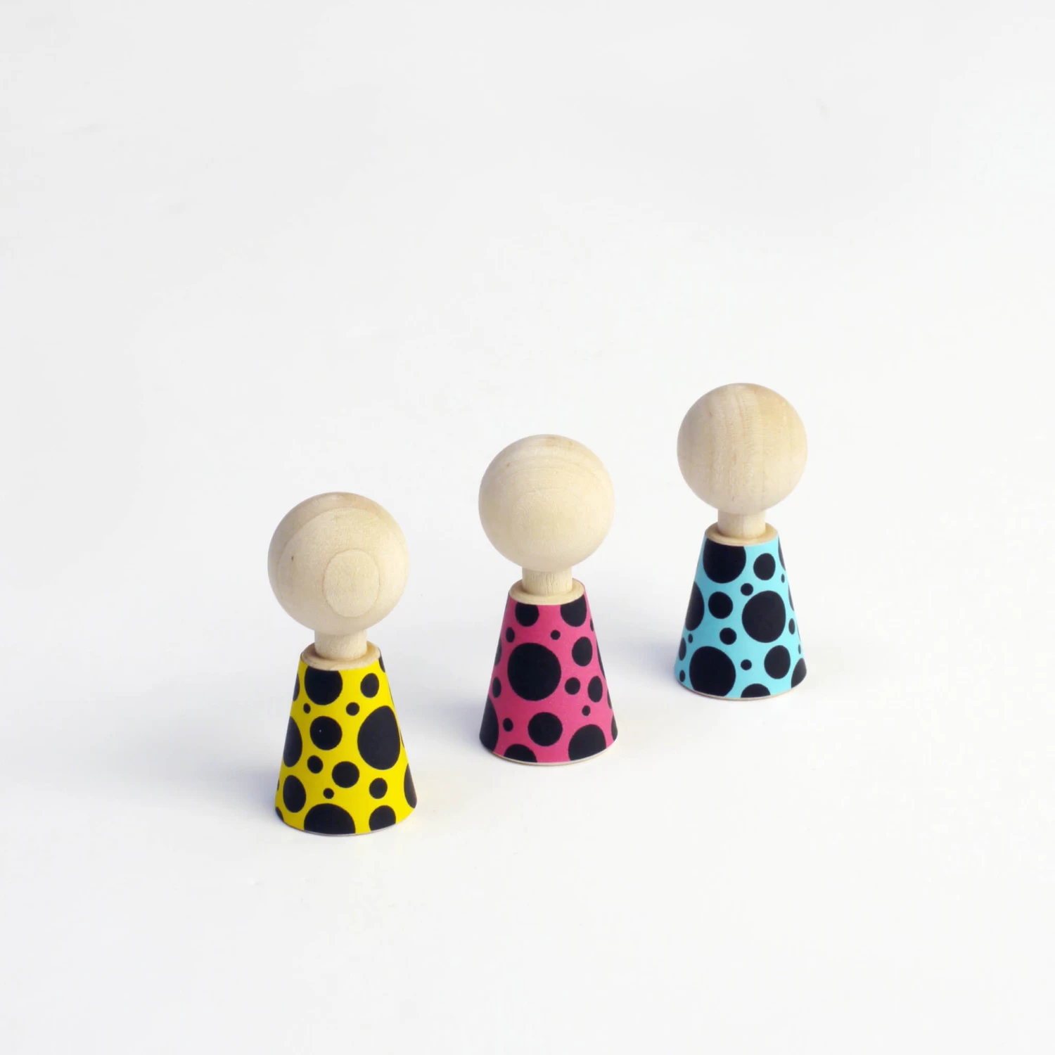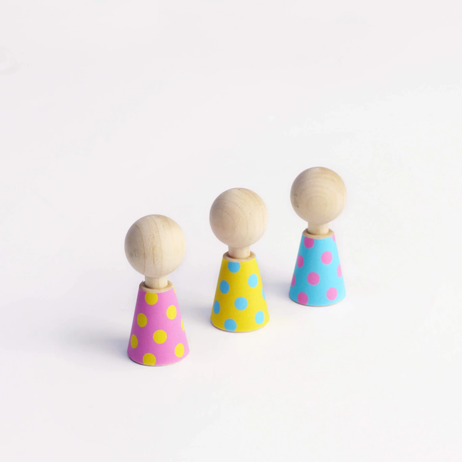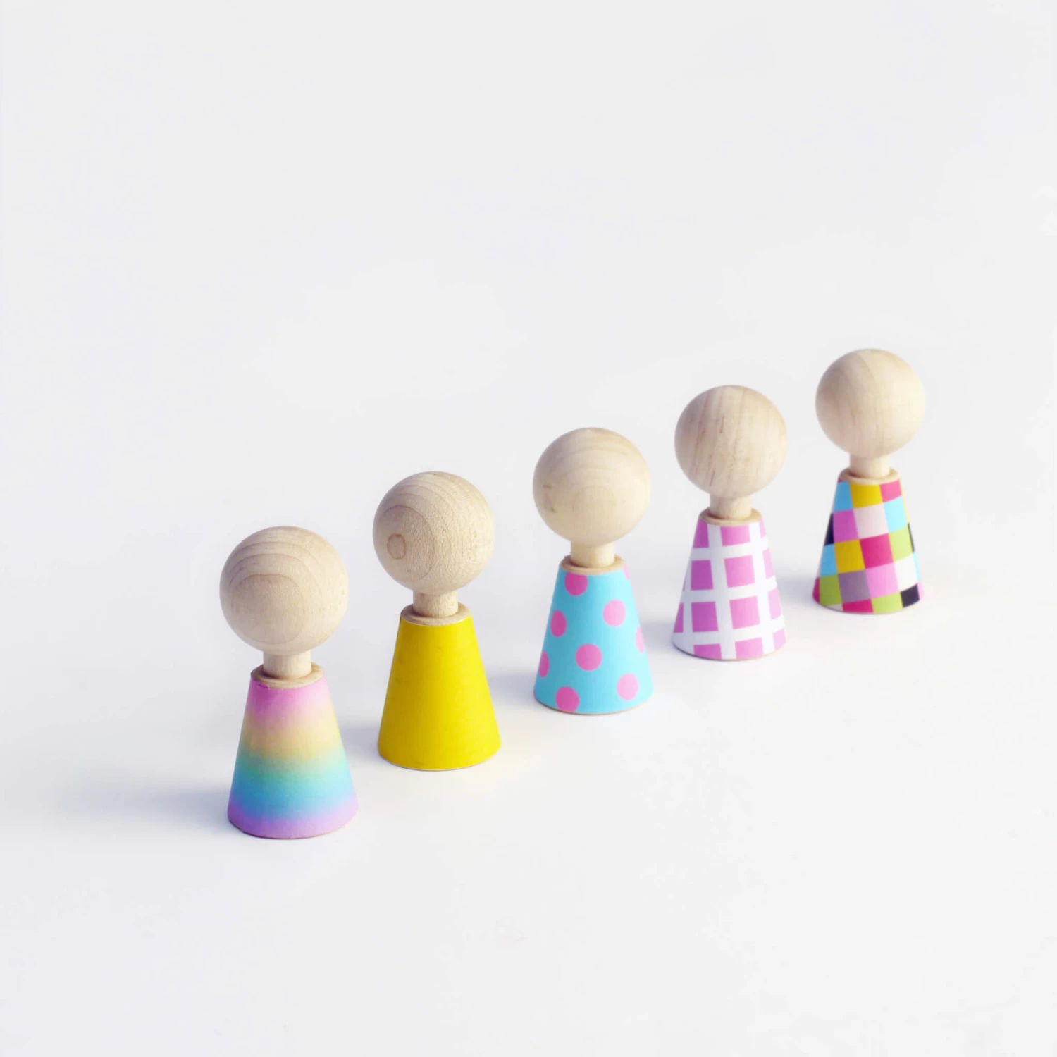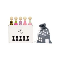 Meet the Colour Pebbles. Five little maple wood dolls with 36 different contemporary outfit changes. Simply stick on the outfit of choice till its time for a costume change, keep old outfits in the supplied book till its time for another change. Keep your little pebbles, their reusable clothes and the booklet neat and tidy in the cotton house bag.
