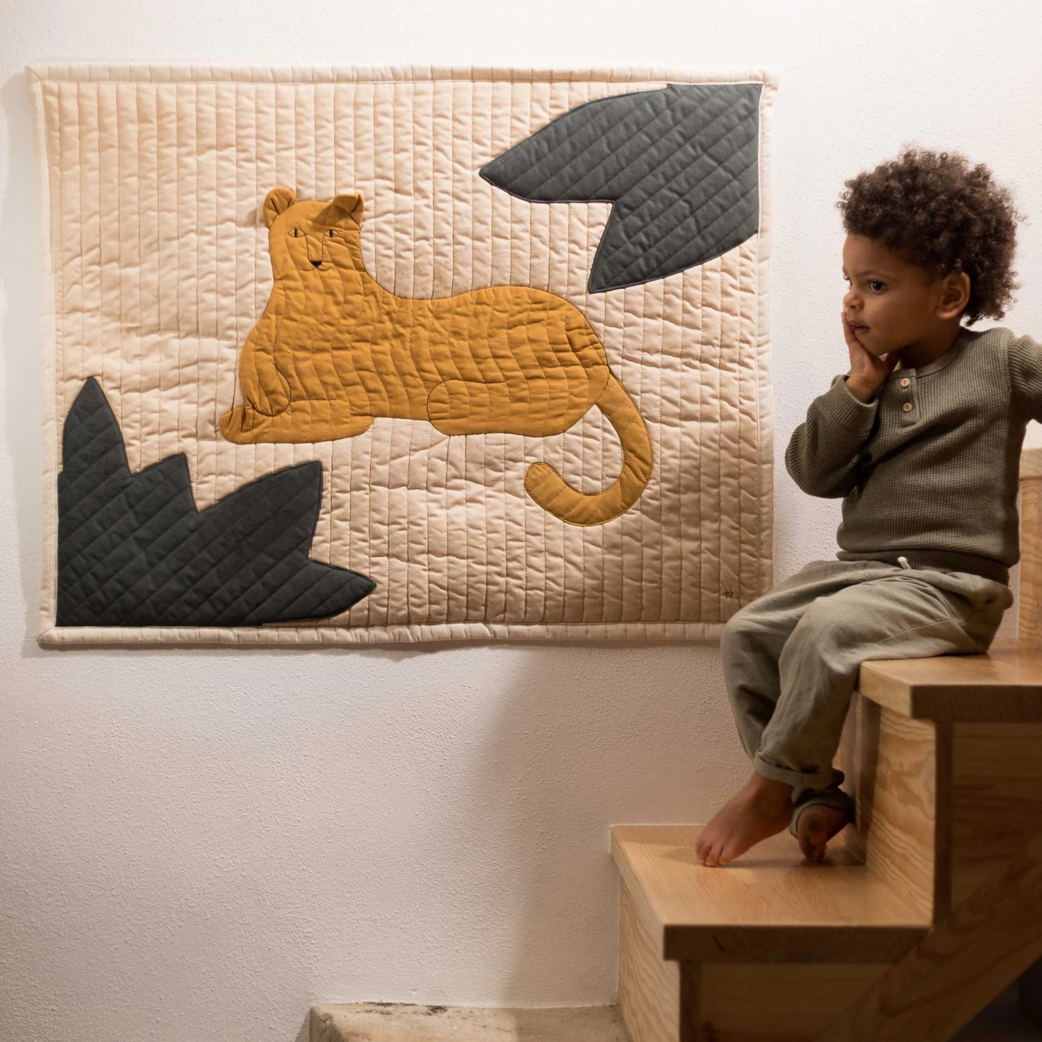Soft and padded they work well as a play mat or little rug by the bed or of course an extra layer on the bed. Then perhaps as your little one grows up (or even before) -they make a unique and joyful arty addition to any room as a wall hanging.