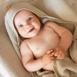 Made from a dense terry cotton and tied at the front its highly absorbent which keeps your little one dry, warm and snug.