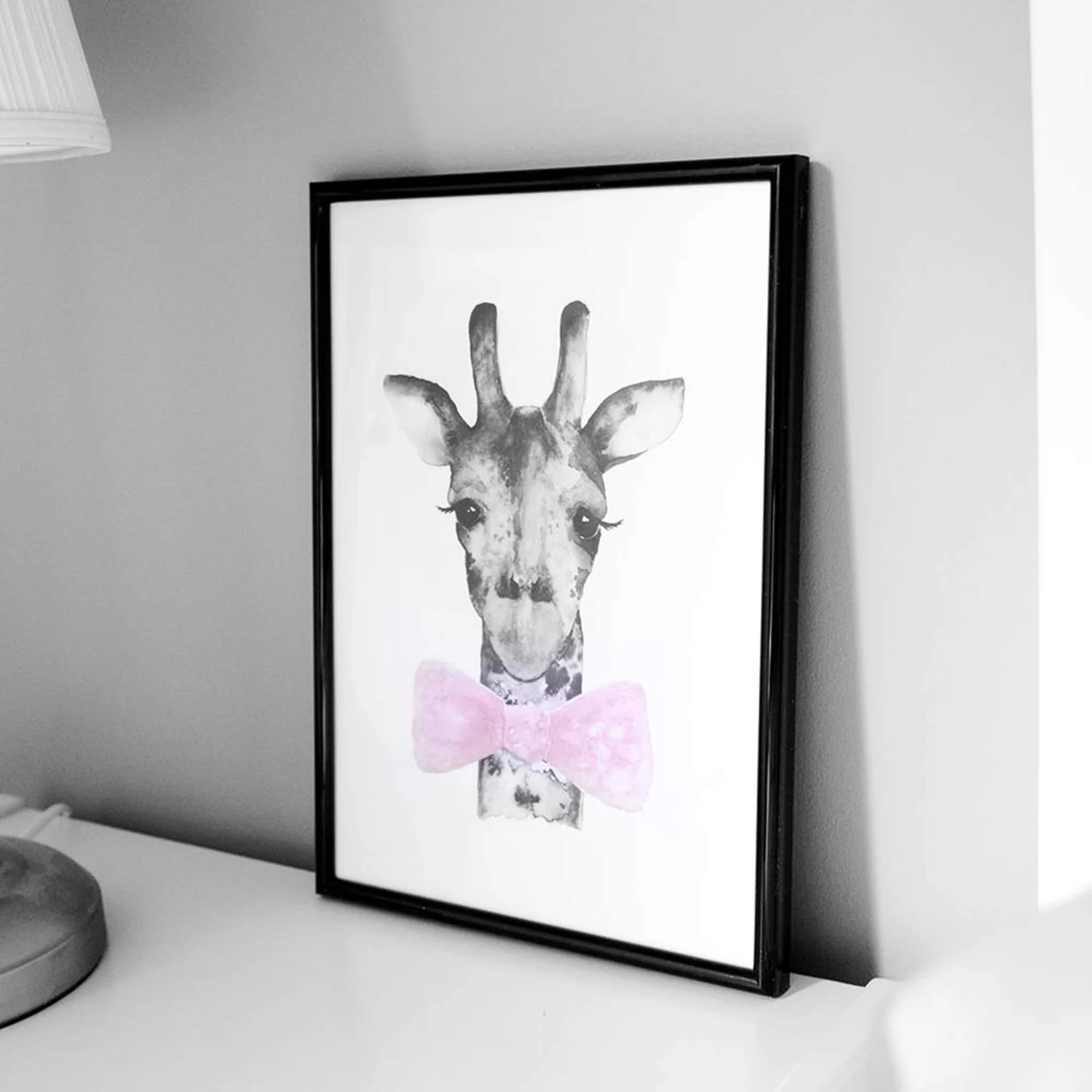 We love this sweet watercolour print from Swedish Fashionell. Mr Giraffe is all dressed up. Chose from a pink or blue bow tie.