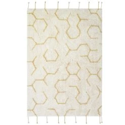 This handcrafted Ivory coloured rug features a labyrinthine pattern and is finished at the edges with braids.