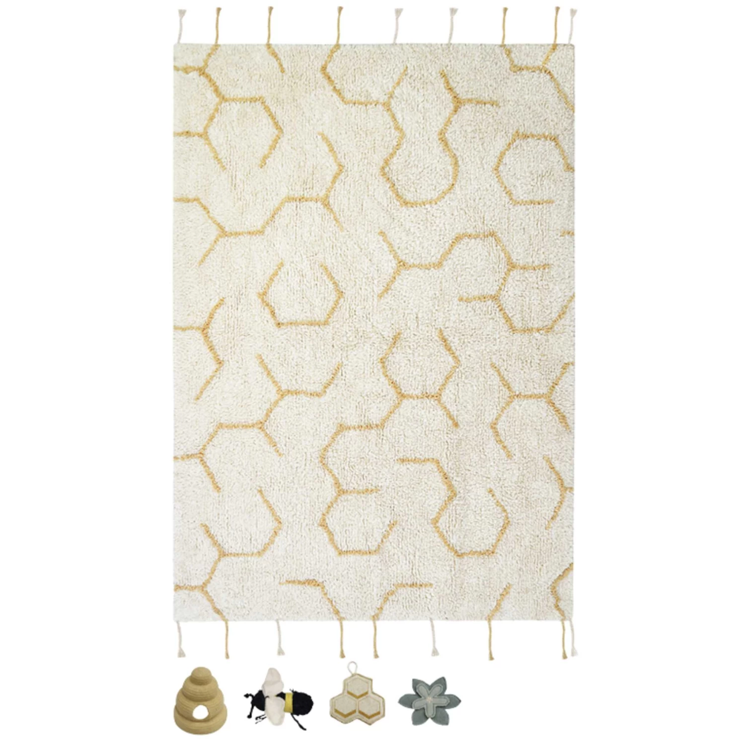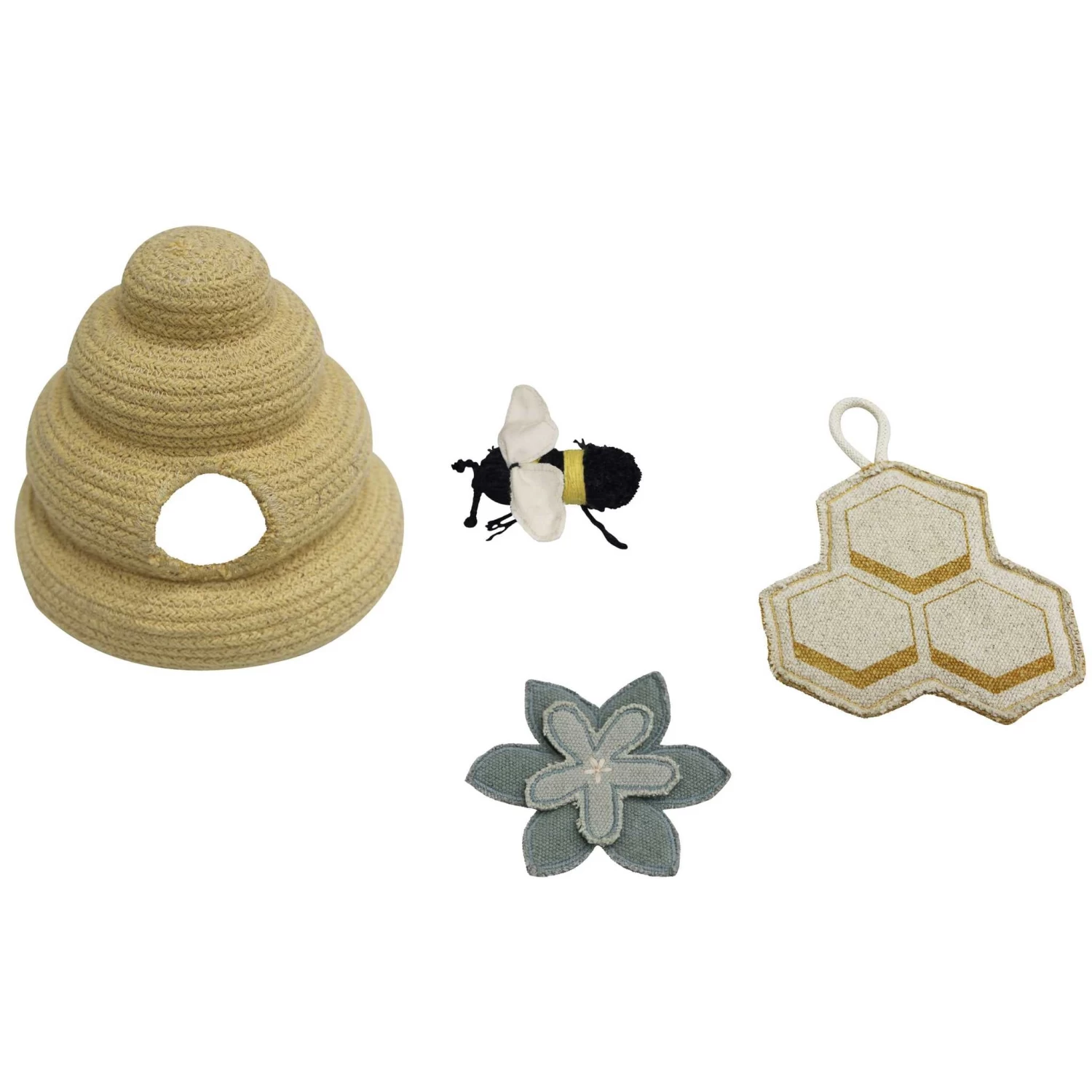 It comes with four handmade textile accessories to play with: a beehive of cotton cords, a canvas flower, a printed cotton canvas honeycomb and a cute little bee.