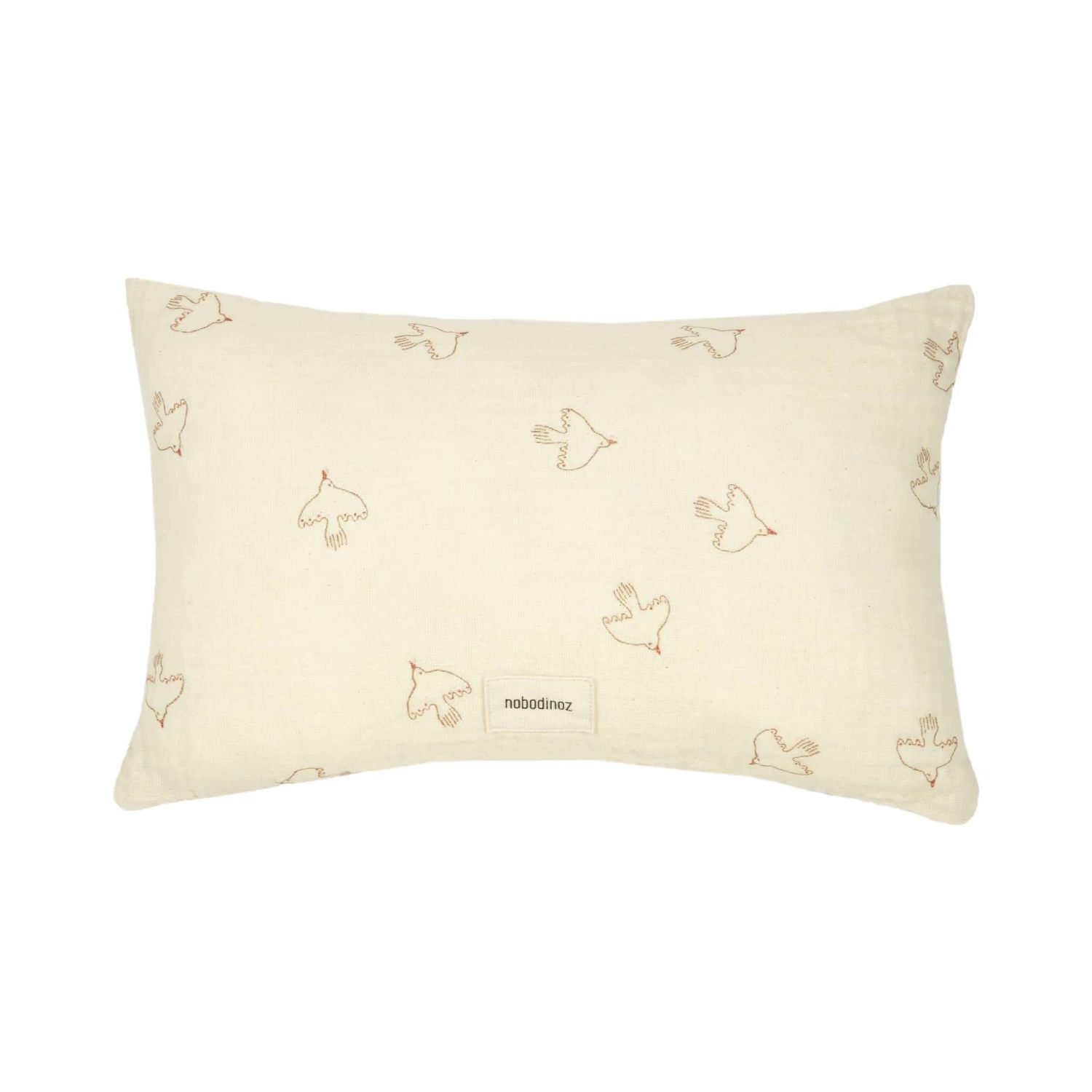 This stylish but simple double organic cotton muslin cushion is soft and cosy. Add to a bed, nursery chair or reading nook to make it extra cosy. This delicate but simple bird pattern will work in any space and mixes well with other patterns, prints and colours.Â