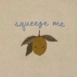 This lemon version from Konges Slojd in organic terry cotton doesn’t get much more snuggly! Pop up the hood, close the poppers and snuggle up. Super soft against the skin and brilliantly absorbable. The lemon embroidery is the sweetest finishing touch.