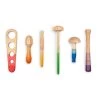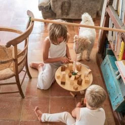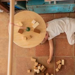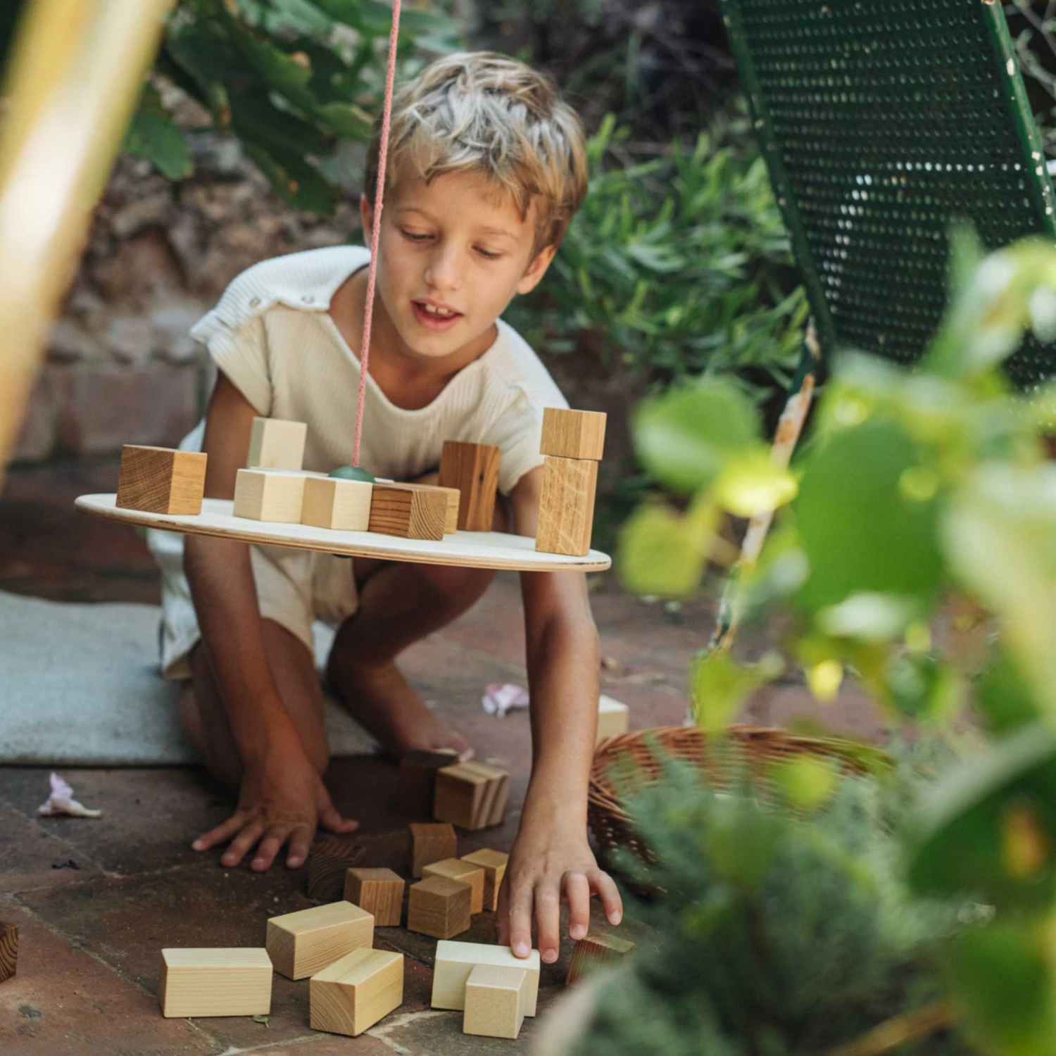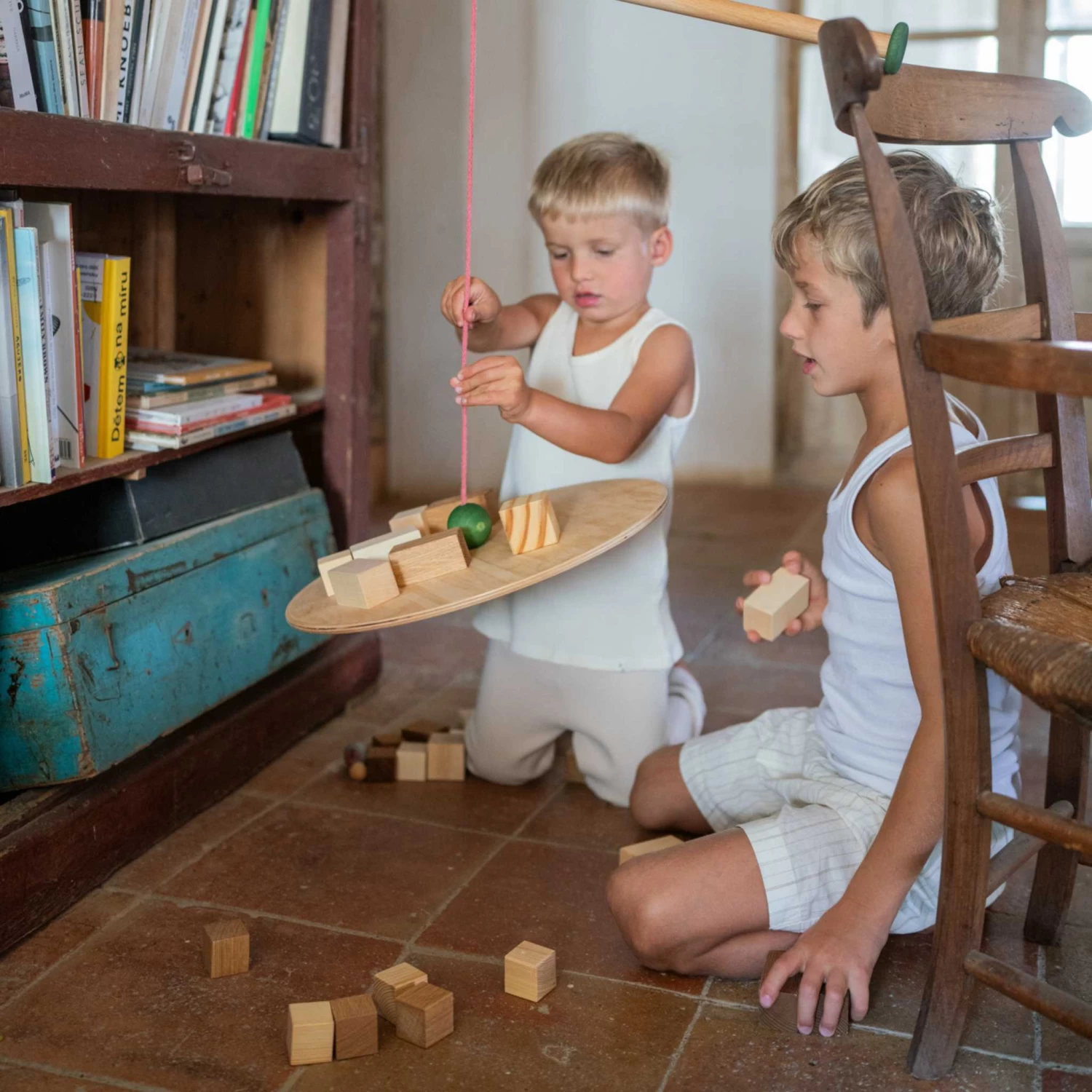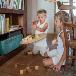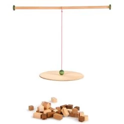 A balance board and a collection of wooden pieces. Challenge yourself to find the perfect balance, make it spin, or experiment with the concepts of physics—all with your own hands!