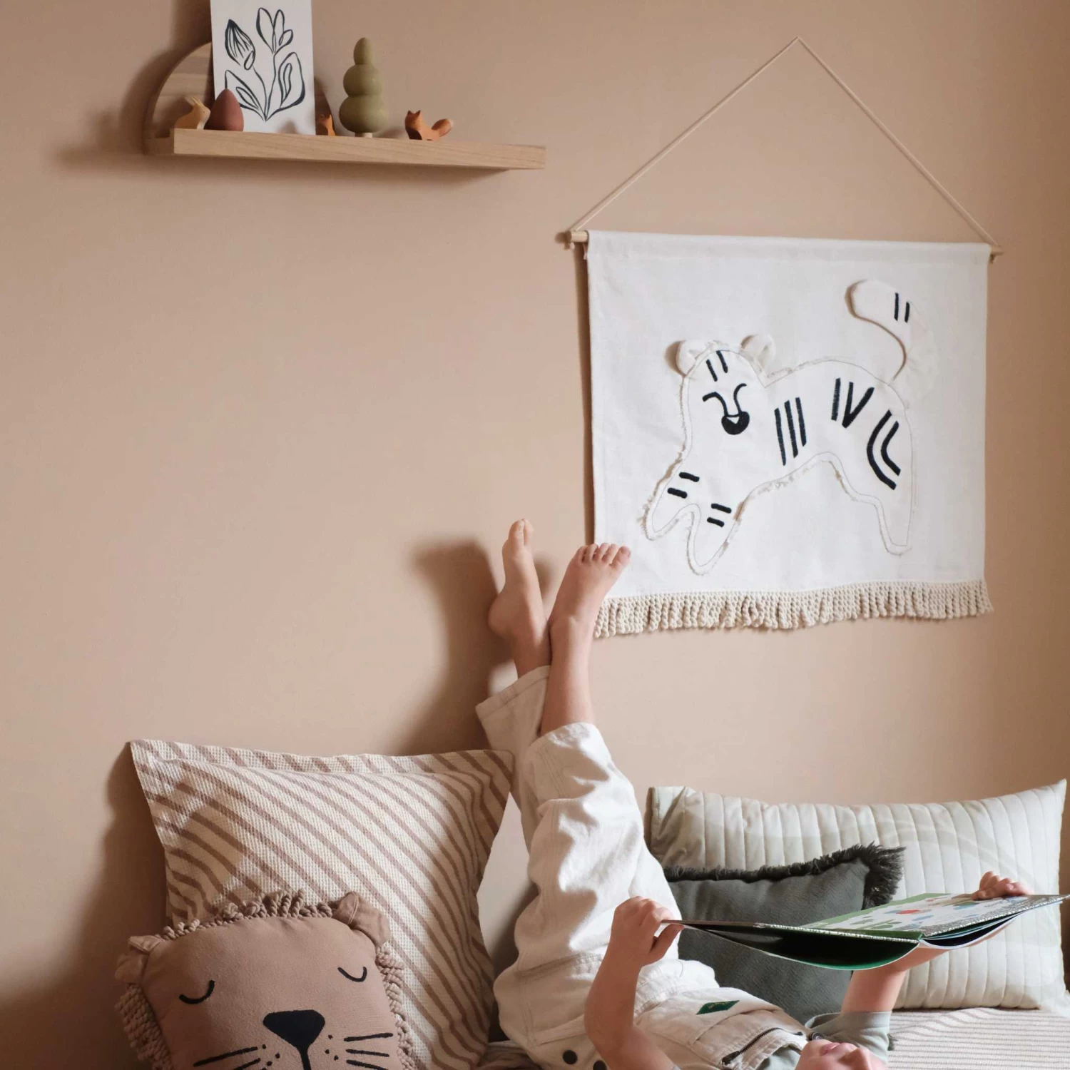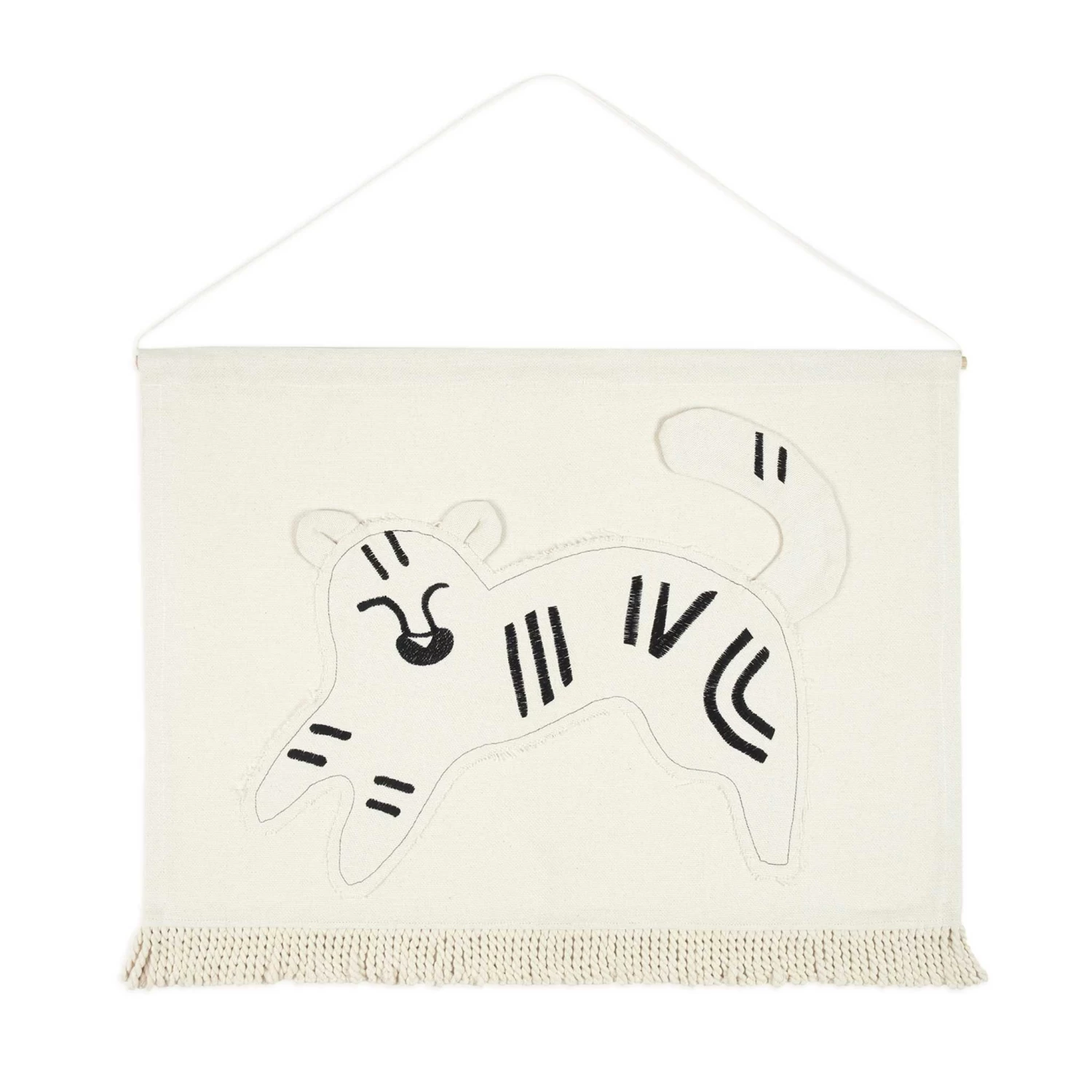 A fun addition to any space! Simply designed with a minimalist feel this embroidered tiger wall hanging makes a fun and unique piece of wall decoration. Its effortless design will ensure it fits with any colourways or themes and your little one will not out grow it. Made in Spain from cotton it comes with the pine bar for super easy hanging and the embroidery and bottom fringe give it a wonderful finishing touch.