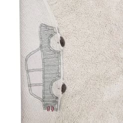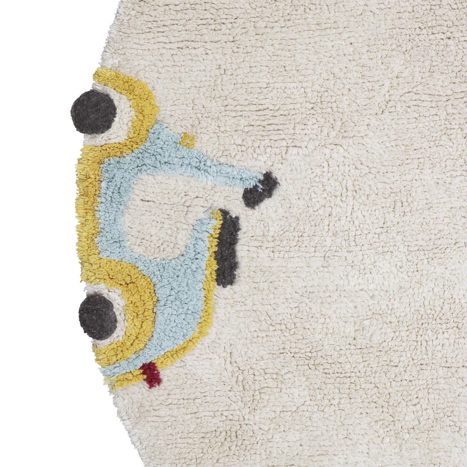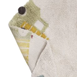 Let your child’s imagination go for a spin on this soft, Wheel rug, circled by e-vehicles and bikes, sporting pom-poms as wheels. This cute vehicle-themed rug in a muted palette of light beige, blues, olive green, and honey yellow is a perfect addition to any childs space and certainly brings an element of fun.
