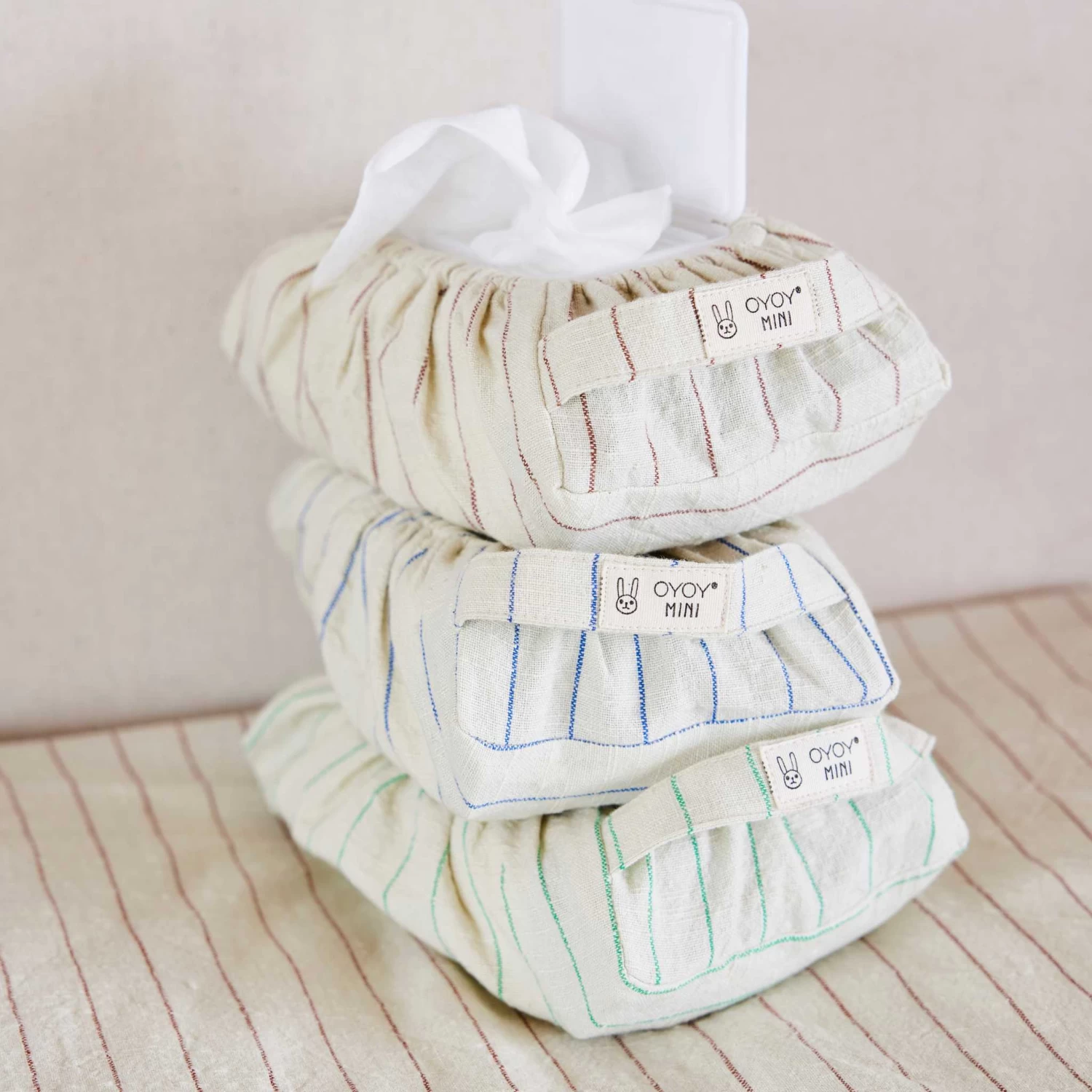 Liven up those essential wet wipes with this cotton wet wipe cover from OYOY in super fun bright green stripes.